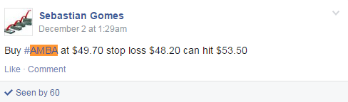 Firstly we told our members in facebook private group to buy Ambarella Inc (NASDAQ:AMBA) on Dec 01st at $49.70. Now look at the price of the stock, its up 17% from our buy call and now at $58. This is how easy money they made. It’s not yet late, join us at specialpennystockalert.com@gmail.com