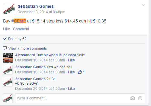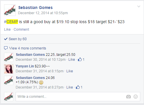 Firstly we told our members in facebook private group to buy Cempra Inc (NASDAQ:CEMP) on 08th December at $15.16. Now look at the price of the stock, it’s 60% from our buy call and now at $24. This is how easy money they made. It’s not yet late, join us at specialpennystockalert.com@gmail.com