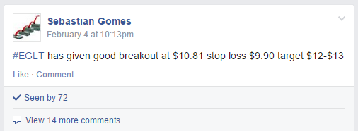 We told our members in facebook private group to buy Egalet Corp(NASDAQ:EGLT) on February 4th at $10,80. Now look at the price of the stock, it’s 30% from our buy call and now at $14. This is how easy money they made. It’s not yet late, join us at specialpennystockalert.com@gmail.com