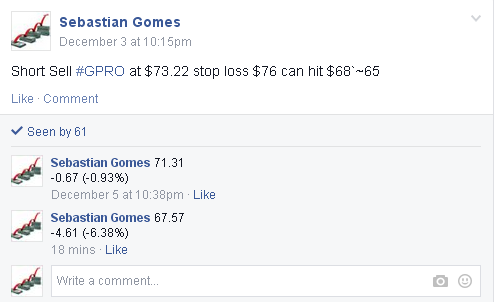 Firstly we told our members in facebook private group to SHORT SELL GoPro Inc (NASDAQ:GPRO) on December 03rd $73.22. Now look at the price of the stock, it’s down 15% from our Sell call and now at $62.50. This is how easy money they made. It’s not yet late, join us at specialpennystockalert.com@gmail.com