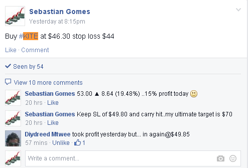 Firstly we told our members in facebook private group to buy Kite Pharma Inc (NASDAQ:KITE) yesterday $46.50 Now look at the price of the stock, it’s up 20% from our buy call and now at $54.90. This is how easy money they made. It’s not yet late, join us at specialpennystockalert.com@gmail.com