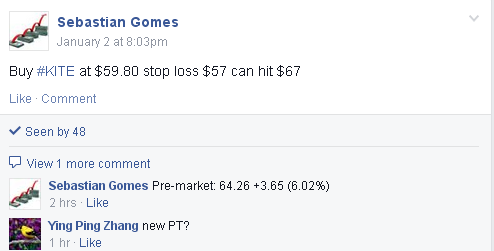 Firstly we told our members in facebook private group to buy Kite Pharma Inc (NASDAQ:KITE) on 02nd January at $59.80. Now look at the price of the stock, it’s 10% from our buy call and now at $66. This is how easy money they made. It’s not yet late, join us at specialpennystockalert.com@gmail.com