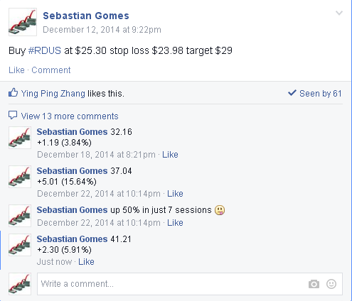 Firstly we told our members in facebook private group to buy Radius Health Inc (NASDAQ:RDUS) on 12th December at $25.30. Now look at the price of the stock, it’s 70% from our buy call and now at $42. This is how easy money they made. It’s not yet late, join us at specialpennystockalert.com@gmail.com