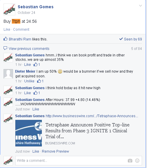 Firstly we told our members in facebook private group to buy Tetraphase Pharmaceuticals Inc (NASDAQ:TTPH) on October 24 at $24.56. Now look at the price of the stock, it’s up 60% from our buy call and now at $38. This is how easy money they made. It’s not yet late, join us at specialpennystockalert.com@gmail.com