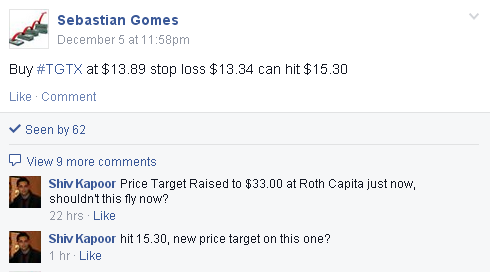 Firstly we told our members in facebook private group to buy TG Therapeutics Inc(NASDAQ:TGTX) on December 05th $13.89. Now look at the price of the stock, it’s up 20% from our buy call and now at $16.55. This is how easy money they made. It’s not yet late, join us at specialpennystockalert.com@gmail.com